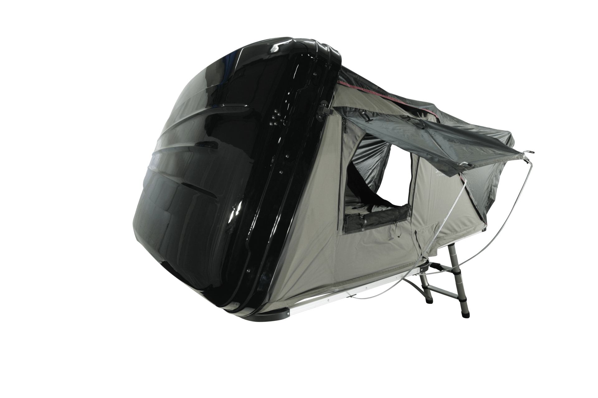 Die Druckluftfedern an der Seite des Korpus unterstützen die überaus schnelle Installation des Autodachzeltes. Hierzu müssen einfach die Schnallen geöffnet und die Schale leicht nach oben gedrückt werden – schon entfaltet sich das Zelt wie durch Zauberhand.