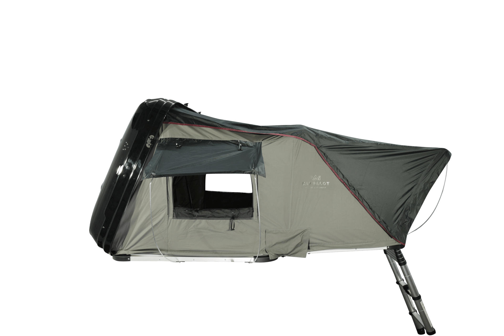 Um den Aufstieg zu dem Dachzelt zu meistern, muss nur noch das Vorderteil ausgeklappt und die mitgelieferte Teleskopleiter auf die gewünschte Höhe eingestellt werden.