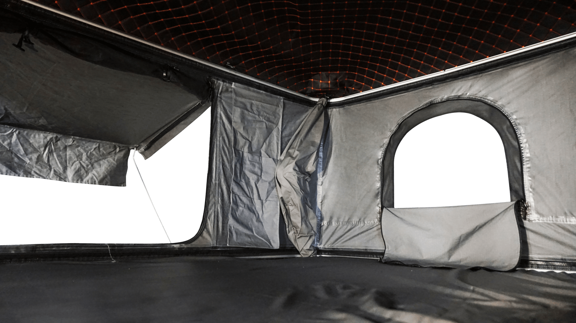 Die Decke des Zeltes ist mit einem feinen Stoff überzogen, wobei sich das unter der Zeltdecke befindliche Netz hervorragend als zusätzlicher Stauraum eignet.