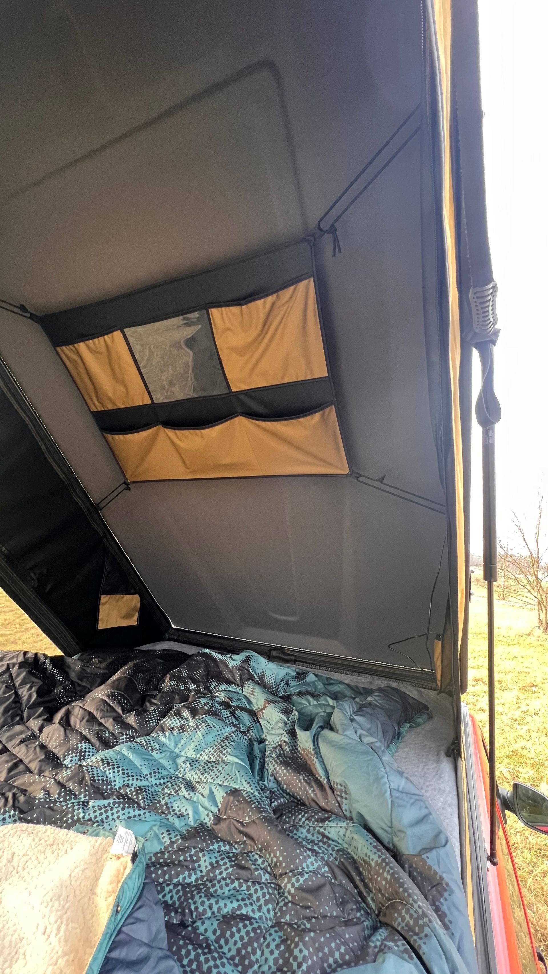 Für den Aufbau einfach die zwei Scharniere lösen und dank den hochwertigen Gasdruckfedersystem von STABILUS öffnet sich das Dachzelt quasi von ganz allein. Im Innenraum erwartet dich aufgrund der großzügigen Fenster zu drei Seiten ein luftiges Raumklima.