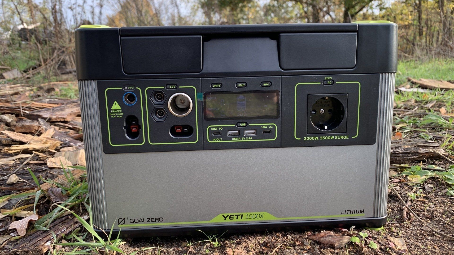 Hochleitungs-Akku von Goal Zero mit Lithium-Ion NMC Akku, MPPT-Laderegler, Digitalanzeige und 2kW Sinus-Wechselrichter. Dieses portable Setup bietet 1.516 Wh Speicherkapazität und versorgt unterwegs Verbraucher wahlweise über USB, 12V DC und 220V AC Anschluß (Schuko-Steckdose).